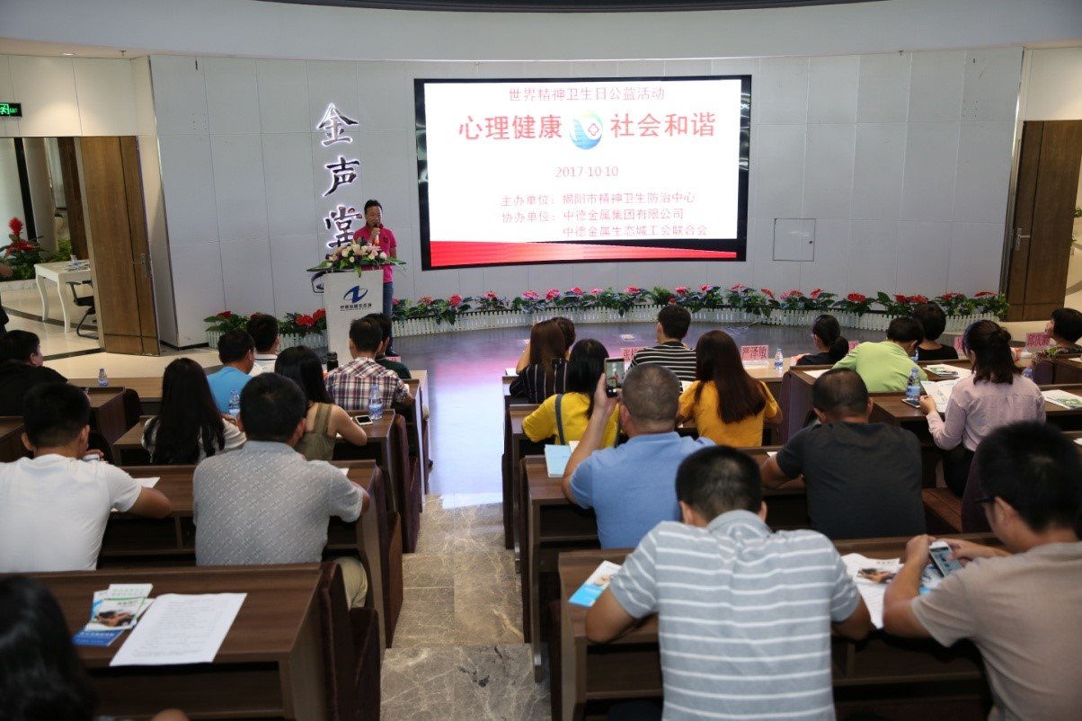 為引起社會(huì)對(duì)精神衛(wèi)生問題的關(guān)注,讓職工對(duì)慢性病防治知識(shí)有所了解,提高職工的健康水平,10月10日上午,由揭陽(yáng)市慢性病防治院主辦,中德金屬集團(tuán)有限公司及中德金屬生態(tài)城工會(huì)聯(lián)合會(huì)協(xié)辦的“心理健康•社會(huì)和諧”健康講座在中德金屬生態(tài)城四大中心金聲堂舉行。市慢性病防治院院長(zhǎng)張梓揚(yáng)等參加活動(dòng)。來(lái)自中德金屬集團(tuán)辦公室、房產(chǎn)營(yíng)銷部、項(xiàng)目管理部、信息技術(shù)部及表處園、建筑公司、物業(yè)公司、研究院等集團(tuán)子公司80多人到場(chǎng)聆聽。