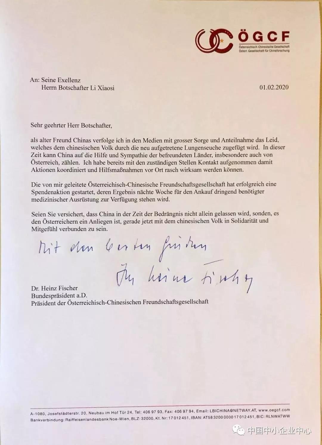 大愛無疆,同心抗疫。中心駐奧地利顧問卡明斯基教授協(xié)調奧中友協(xié)主席、奧地利前總統(tǒng)菲舍爾在疫情期間也發(fā)表了致中國人民的講話慰問視頻,并致信中國駐奧地利大使李曉駟,對中國抗擊新型冠狀病毒肺炎疫情表示積極支持并愿意施以援手的聲明。