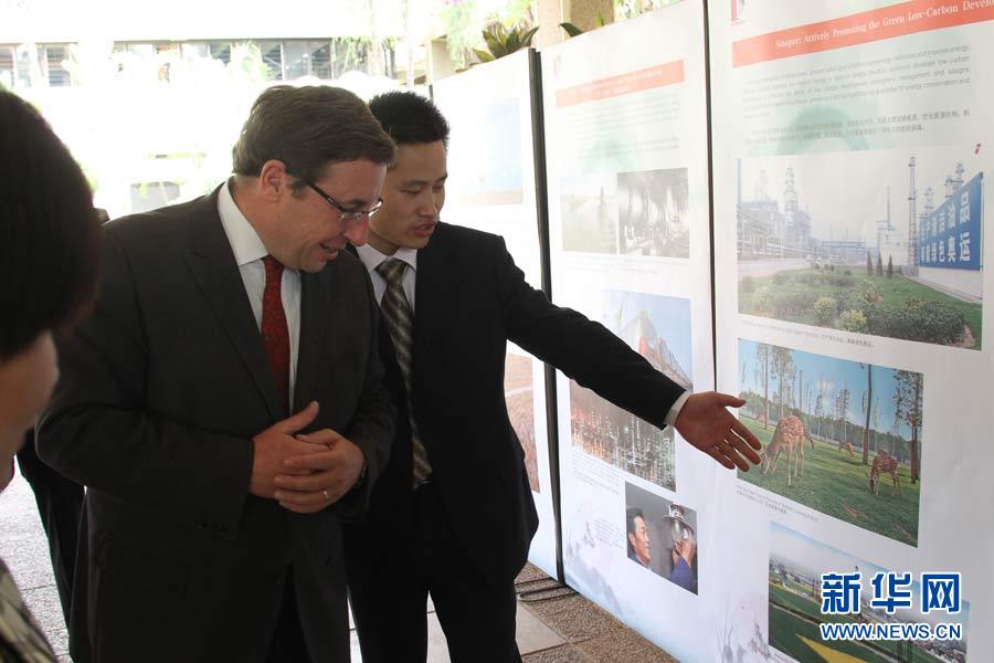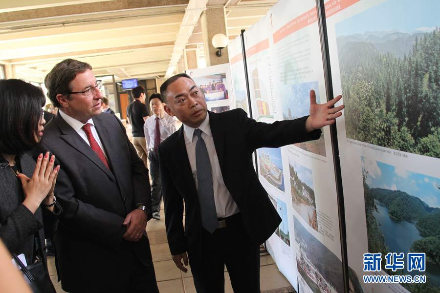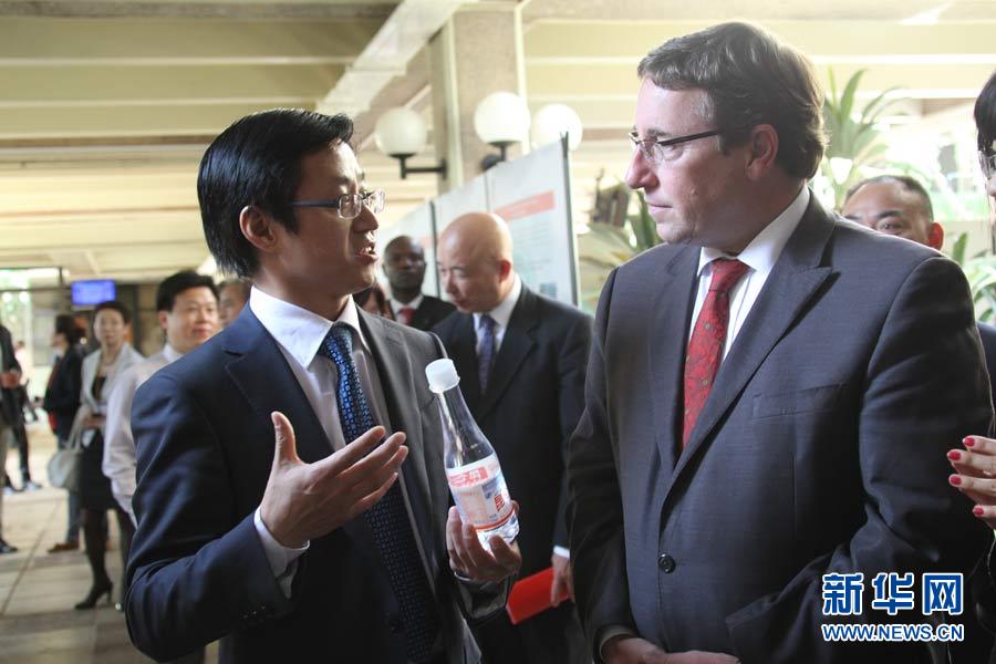 廣東省揭陽市副市長陳澄民(左)向聯(lián)合國副秘書長施泰納介紹揭陽市環(huán)保圖片。5月20日,“明月行動.綠色中國夢”大型環(huán)保公益活動中國環(huán)保圖片展在肯尼亞首都內(nèi)羅畢聯(lián)合國環(huán)境規(guī)劃署新華影廊舉行,展示中國地方政府和大型國資企業(yè)與知名企業(yè)關(guān)注環(huán)保、力行環(huán)保、堅持環(huán)保的上百張圖片,廣東省揭陽市政府、中國石化集團、西安浐灞生態(tài)區(qū)和加多寶集團昆侖山礦泉水公司等代表在展覽中向聯(lián)合國官員及來賓介紹生態(tài)環(huán)保成就。汪勇基攝
