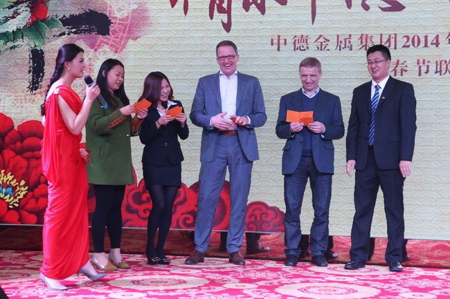 駿馬騰飛成壯舉,靈羊起步赴新程。2015年2月12日,中德金屬集團(tuán)在榕江大酒店舉辦了以“情系中德·執(zhí)夢(mèng)遠(yuǎn)航”為主題的2014年度總結(jié)表彰大會(huì)暨春節(jié)聯(lián)歡晚會(huì)。德國(guó)歐綠保集團(tuán)董事會(huì)成員、集團(tuán)COO、綠色燃料合資公司董事馬丁·貝克雷特曼(Martin Becker-Rethmann)、艾薩醫(yī)療技術(shù)公司總經(jīng)理邵愛(ài)民等外國(guó)嘉賓應(yīng)邀參加此次盛會(huì),與集團(tuán)領(lǐng)導(dǎo)以及全體公司員工共度了一個(gè)難忘而美好的夜晚。