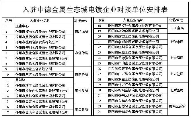 為貫徹落實(shí)全市電鍍產(chǎn)業(yè)發(fā)展推進(jìn)會(huì)會(huì)議精神,全力加快中德金屬生態(tài)城電鍍園區(qū)建設(shè),努力打造綠色電鍍產(chǎn)業(yè)高地,全市各地各部門(mén)主動(dòng)作為,加強(qiáng)協(xié)調(diào),形成合力,結(jié)對(duì)支持,切實(shí)幫助入駐園區(qū)電鍍企業(yè)解決投產(chǎn)建設(shè)過(guò)程碰到的各項(xiàng)問(wèn)題,助推企業(yè)盡早投產(chǎn)運(yùn)營(yíng)。根據(jù)安排,市環(huán)保、經(jīng)信、商務(wù)等部門(mén)和揭東區(qū)政府等十家單位將對(duì)首批34家入園電鍍企業(yè)進(jìn)行結(jié)對(duì)支持。