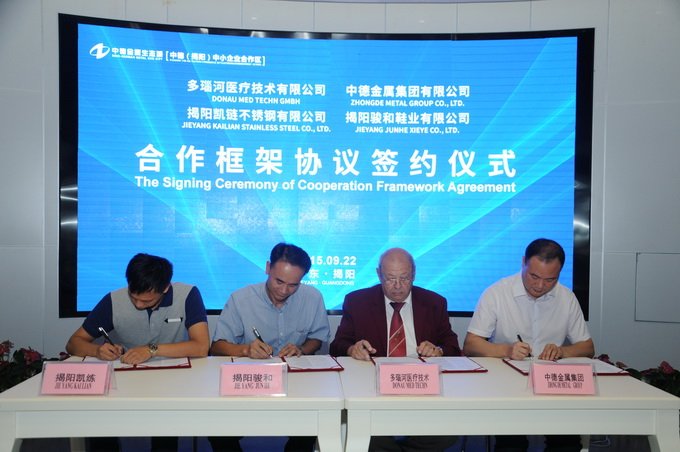 市凱鏈不銹鋼、市駿和鞋業(yè)、中德金屬集團與德國多瑙河醫(yī)療技術(shù)公司簽訂合作框架協(xié)議