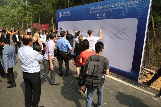 通過實(shí)地考察和聽取情況介紹,德國(guó)中小企業(yè)經(jīng)理人對(duì)中德金屬生態(tài)城表現(xiàn)出濃厚興趣。在開班儀式后,他們來到了中德金屬生態(tài)城萬畝森林公園植下中德友誼之樹,并在留言墻上寫下寄語(yǔ)。MAE中德咨詢公司執(zhí)行董事馬恩工工整整地寫下“中德合作共贏”六個(gè)漢字,而CNGE國(guó)際咨詢責(zé)任有限公司首席執(zhí)行官托馬斯。諾爾廷則用“非常好”的拼音表達(dá)了他對(duì)中德金屬生態(tài)城的印象!拔覀儠(huì)再見的,揭陽(yáng)!”留言墻上記錄了德國(guó)中小企業(yè)經(jīng)理人的熱切期待和美好愿景。